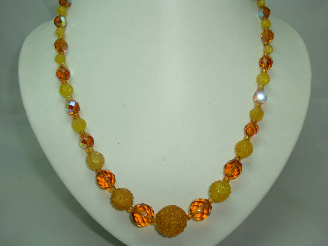 We are pleased to offer this fab vintage 1950s graduating ab citrine crystal glass bead and amber coloured "sugar coated" glass beads.  As you can see from the photos, the necklace is in excellent condition, very unusual mix of beads, looks really super on.