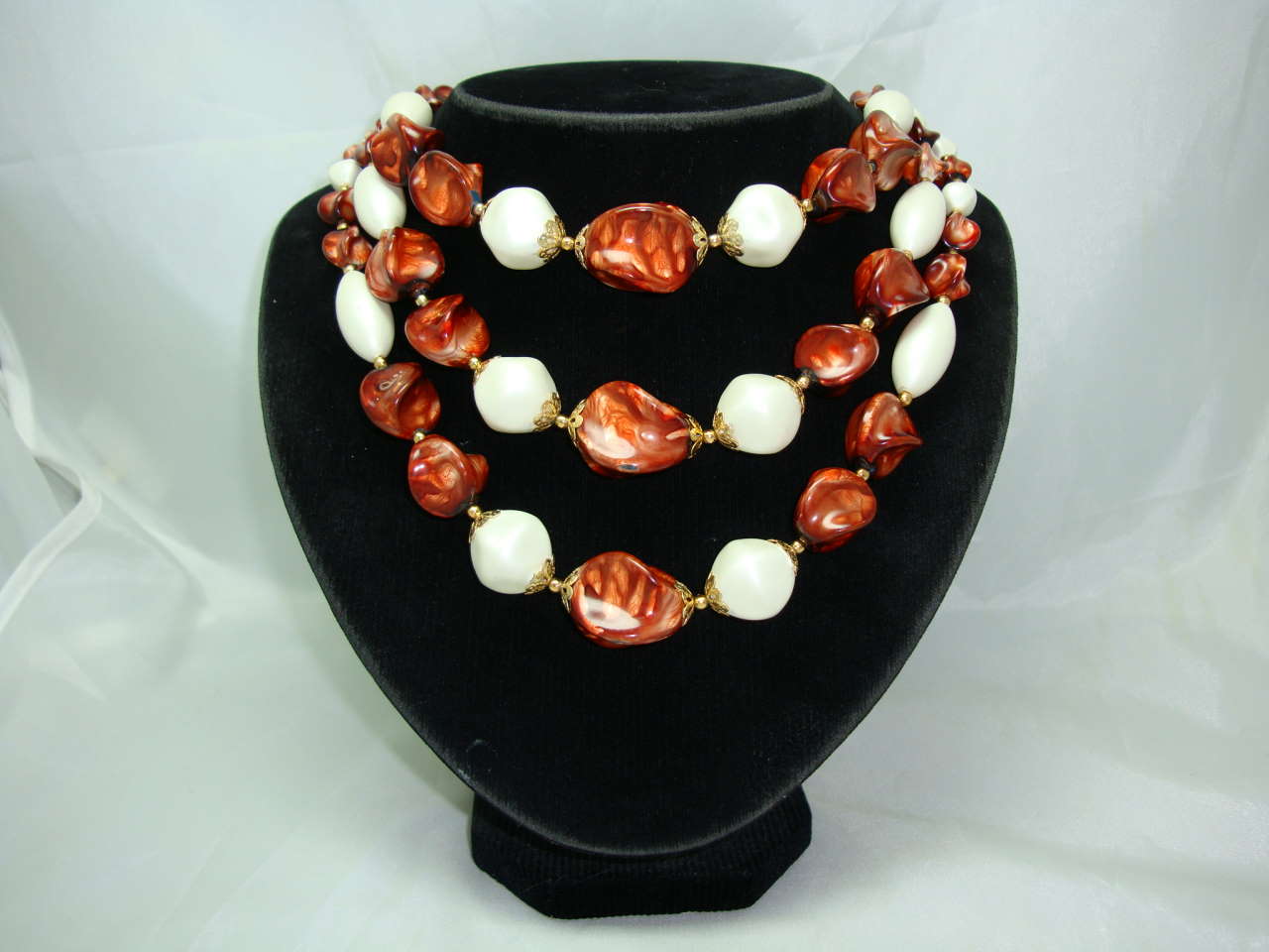 We are pleased to offer to stunning vintage 1950s chunky 3 row graduating brown marble effect lucite bead and faux pearl bead necklace which is just fabulous. As you can see from the photos, the necklace is in excellent condition and looks amazing on. This really is a stunning vintage necklace, comes with 3 inch extender for extra length, great mixture of different shaped beads, very unusual and unique.