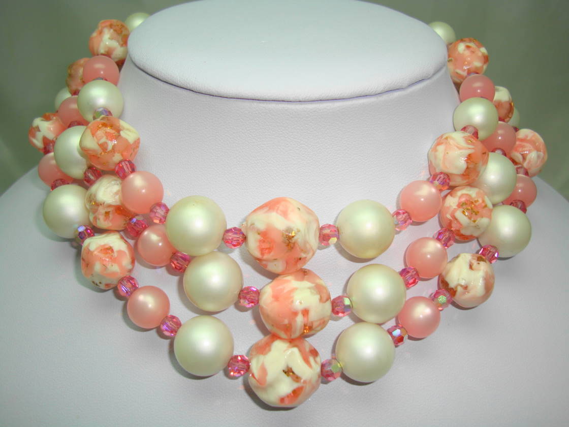 1950s Fab 3 Row Pink and White Lucite Crystal and Pearl Bead Necklace