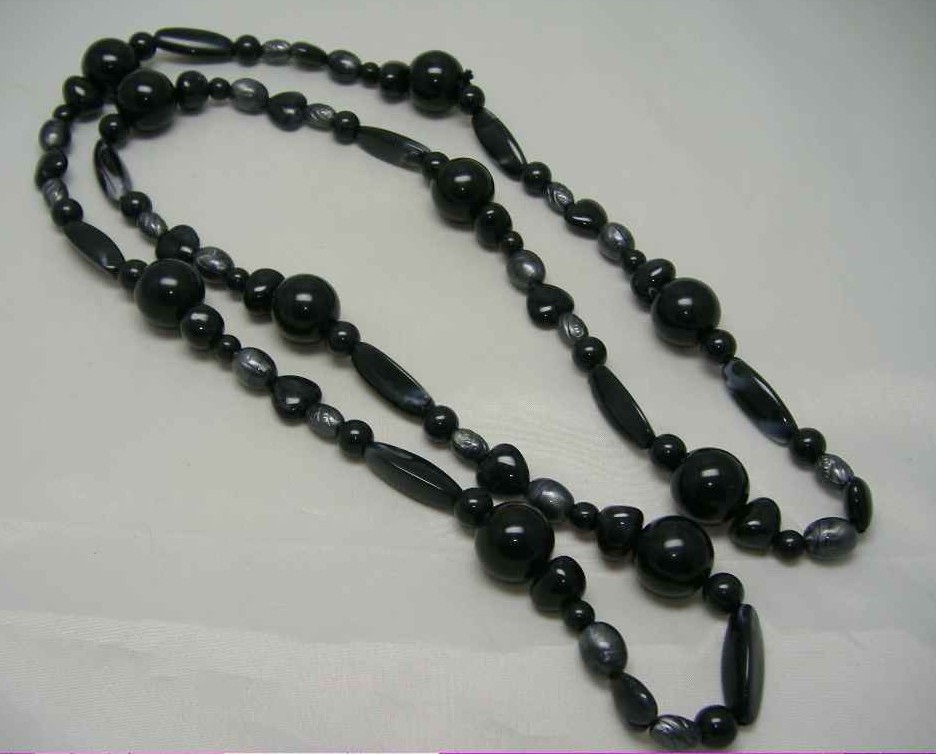 1950s Long Black & Grey Marble Lucite Bead Necklace WOW