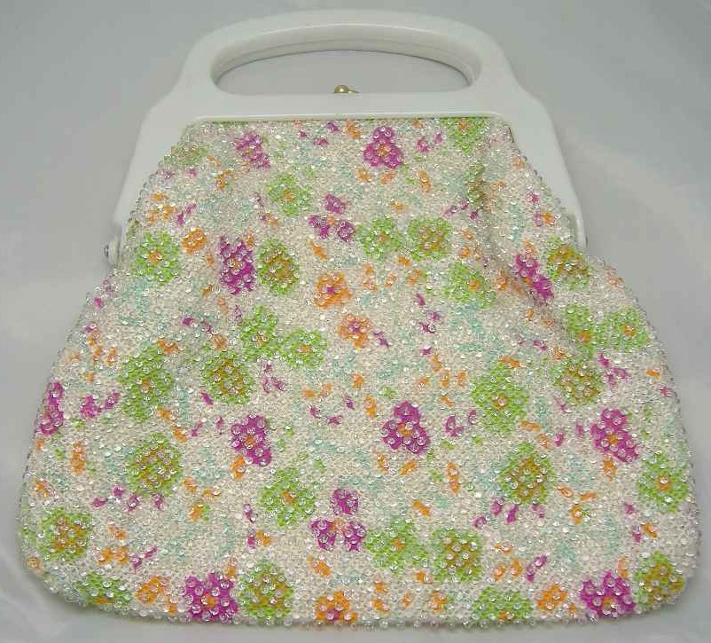 Lovely vintage 1950s this fabulous white handbag with lovely white plastic frame with a gold ring fastener which is just stunning. As you can see, the handbag is made up of printed green, orange, pink and blue flowers and is embellished with tiny clear lucite plastic beads. The handbag is very clean inside and is lined in a lovely white material. It has a pocket edged with gold and is very spacious inside. I don't think this handbag has ever been used - it is spotless!! Labels reads made in Hong Kong - a great vintage handbag which can be used during the day or at night - don't miss out on this one ladies, a very unusual vintage handbag, no-one will have another one like it.
