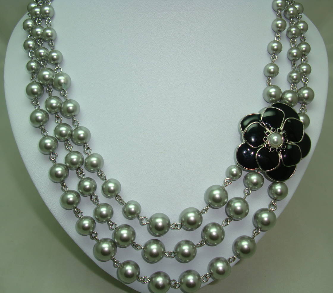 1950s Style 3 Row Grey Faux Pearl Bead Necklace Black Enamel Flower
