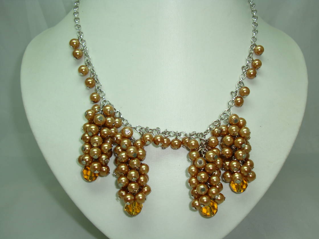 We are pleased to offer this stunning vintage 1950s style gold glass faux pearl and crystal bead cluster drop necklace on silvertone chain.  As you can see from the photos, the necklace is very attractive, the clusters remind me of bunches of grapes!  Excellent condition as item is brand new - I do not usually go for modern pieces but this one caught my eye - really good quality and weight to this one, (the faux pearls are made from glass, not plastic - it is very well made and looks stunning on, a real eye catcher!