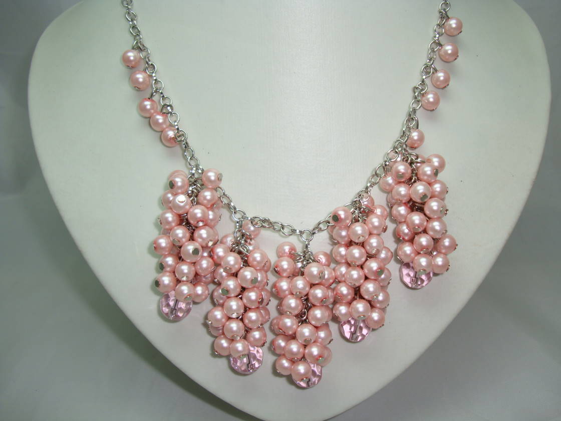 1950s Style Pink Faux Pearl Bead Cluster Drop Necklace