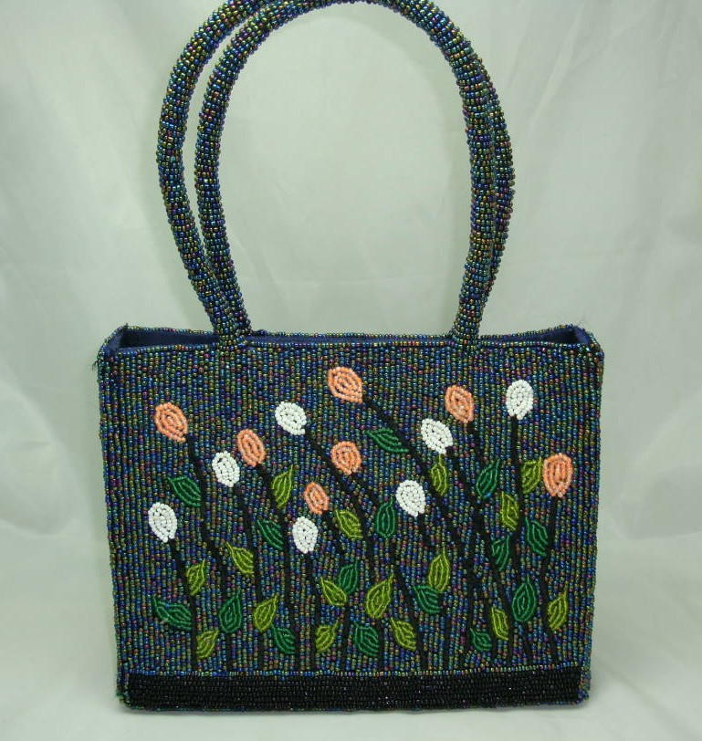 We are pleased to offer this lovely vintage 1950s style beautiful beaded evening handbag in a pretty flower design.  Very well made and really good quality - fastens with magnetic stud fastener, interior lined in deep navy blue satin lining with side pocket.  The handles are just long enough in order that the handbag can be worn over the shoulder as well.  The bag  is made up of beautiful glass seed beads primarily ab carnival peacock coloured beads which really caught the light.  The flower design is also featured on each side of the handbag as well - real attention to detail.. The bag is brand new so it is in excellent condition - I don't usually go for modern items but this handbag really caught my eye - very quirky and unusual design, a real eye catcher.