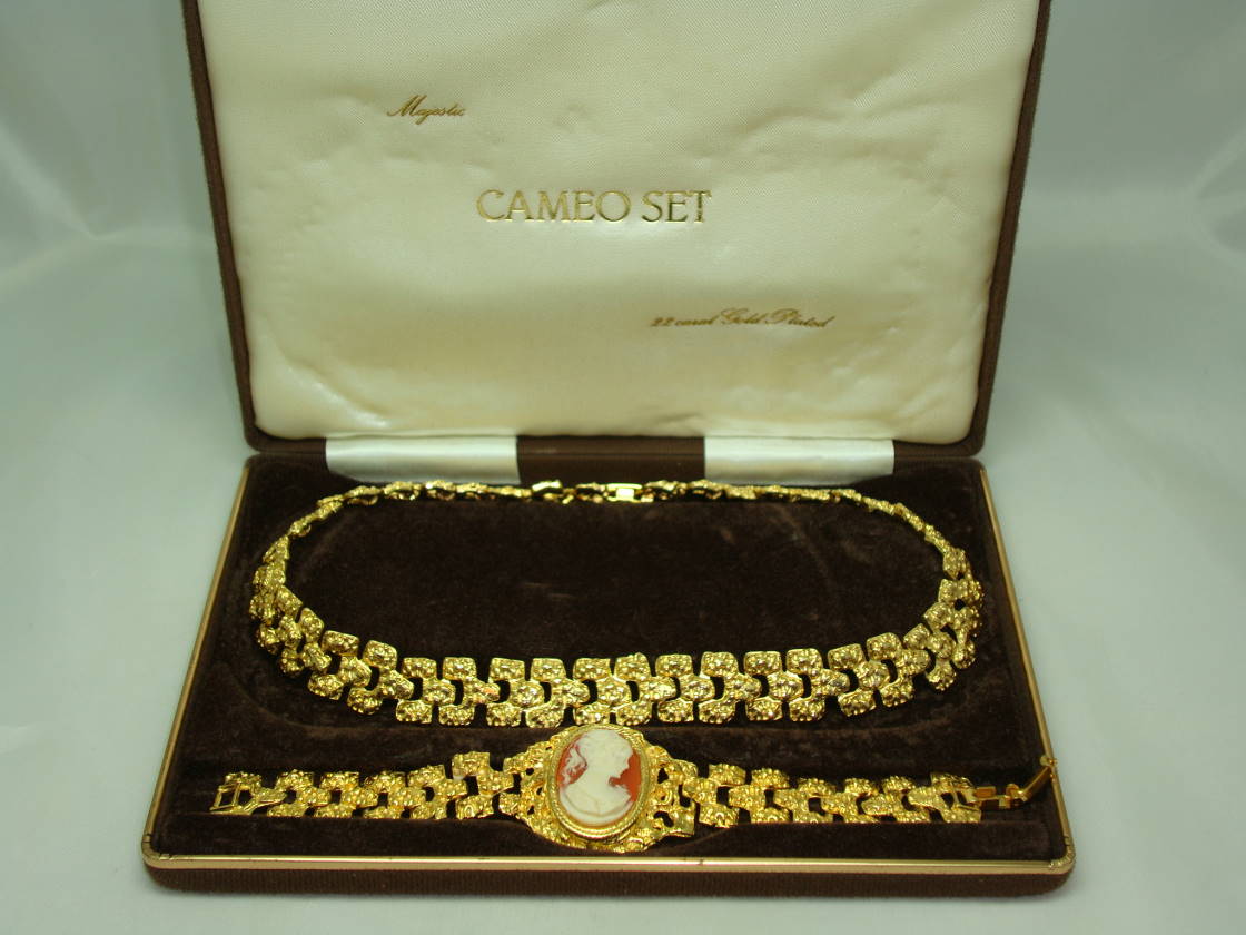 1960s Signed Majestic 22ct Gold Plate Necklace and Cameo Bracelet Set