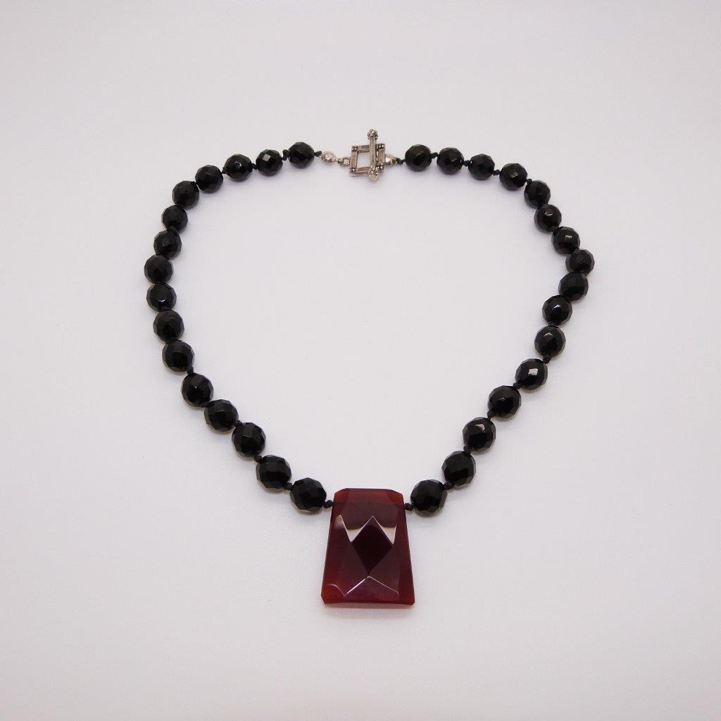 Classy Black Glass Bead Necklace with Cornelian Faceted Cut Drop Pendant