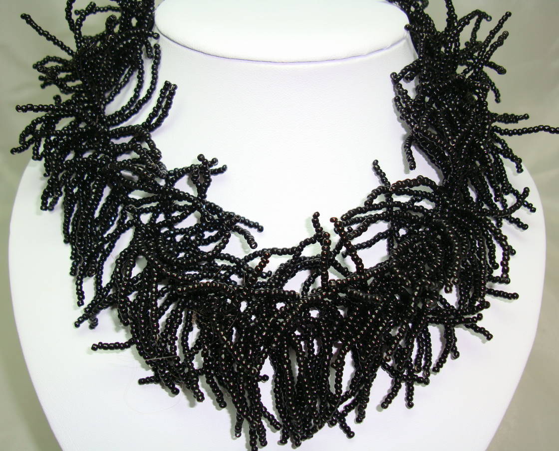 Designer Wide Black Glass Seed Bead Collar Necklace Statement Piece!