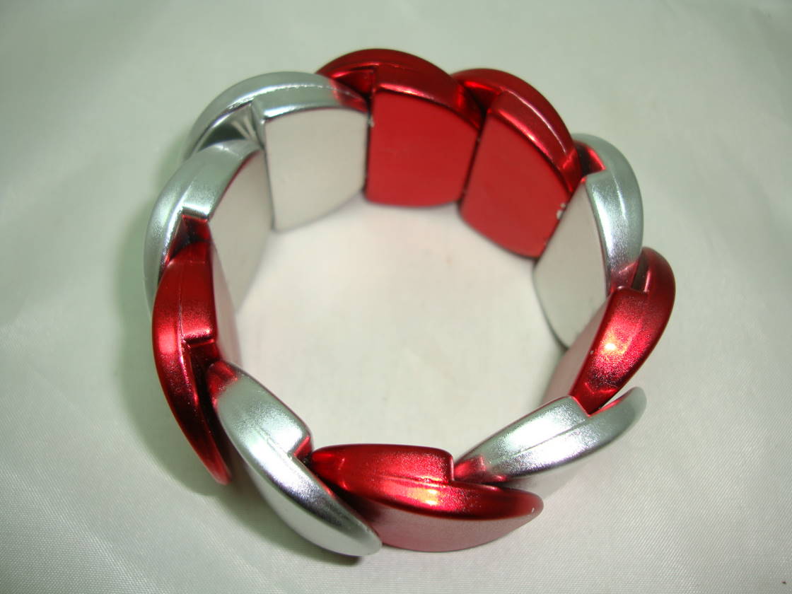 Fabulous wide metallic red and silver circle disc design stretch bracelet with is just fab.  Looks stunning on, will fit any wrist sizes as bracelet is elasticated.  Very good condition apart from a few tiny nicks to paint on two of the red discs but not at all noticeable.
