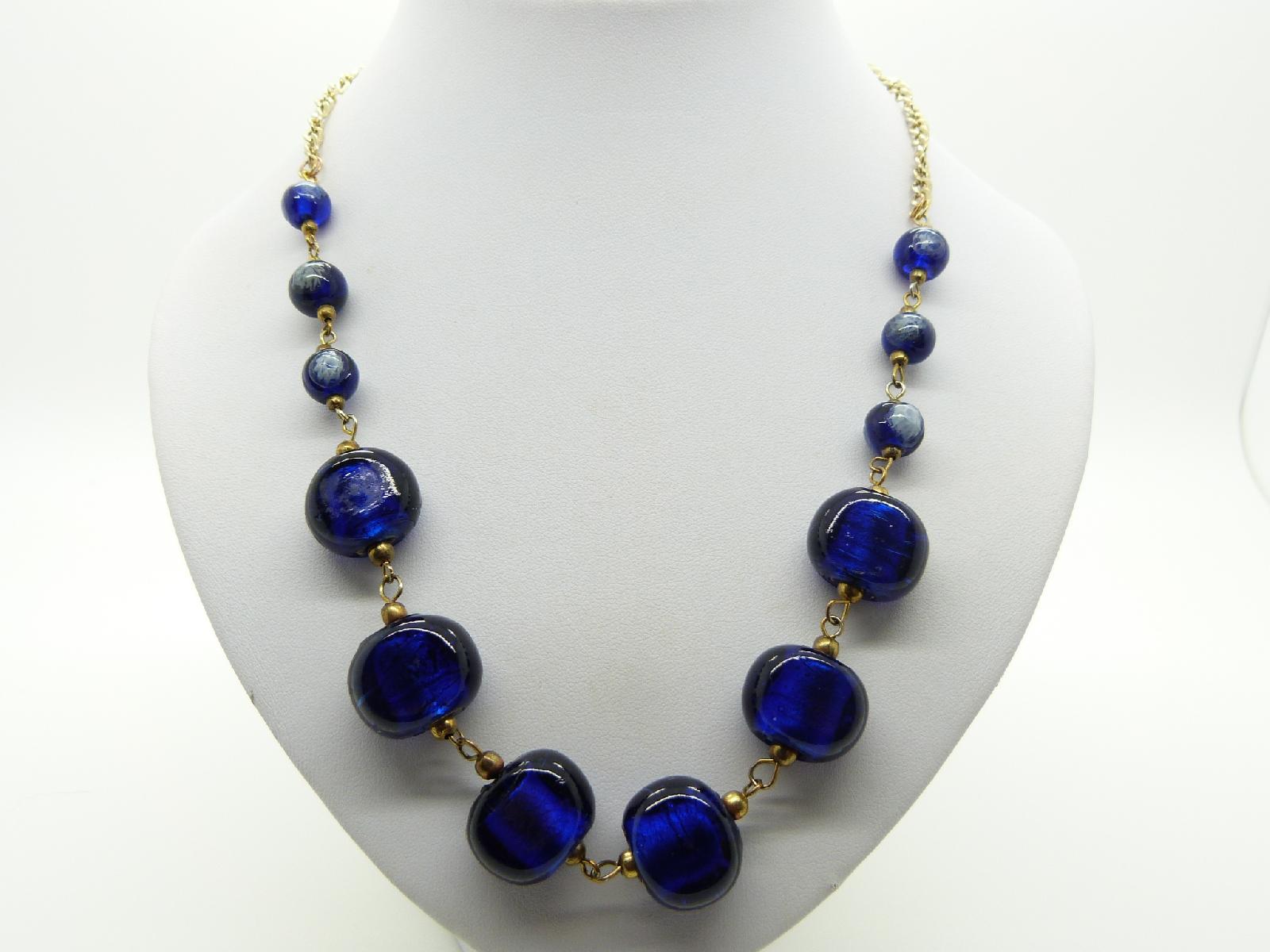 Lovely violet blue glass bead necklace on goldtone chain, looks very pretty one, very unusual colour, excellent condition as necklace is a modern piece, measures 61cms in length.