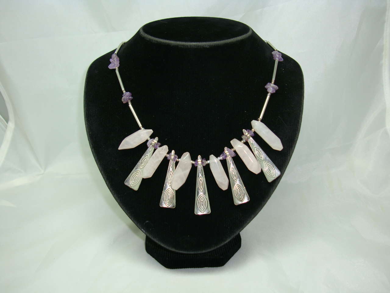 We are pleased to offer this fabulous contemporary modernist style silvertone necklace which is just stunning.  As you can see from the photos, the necklace is made up of real rose quartz polished beads and amethyst chips.  The necklace has long silvertone fancy drop links interspersed with the rose quartz.  This really is a stunning piece, I do not usually go for modern items but this one is exceptional.  Excellent condition, great quality and style, looks really unique and stylish on.