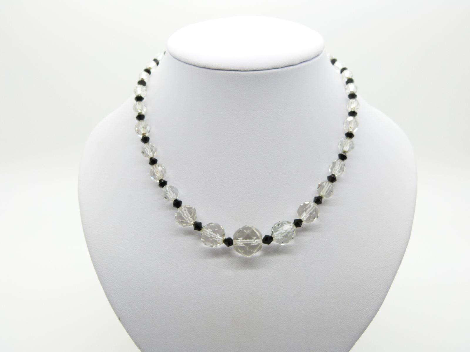 Vintage 30s Art Deco Pretty Black and Clear Crystal Glass Bead Necklace