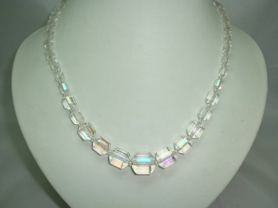 Beautiful vintage 1930s graduating ab crystal glass barrel shaped faceted bead necklace with barrel screw fastener.  Excellent vintage condition, lovely sparkle to the beads which are a very unusual shape, great quality and weight to this one.  Looks really pretty on.