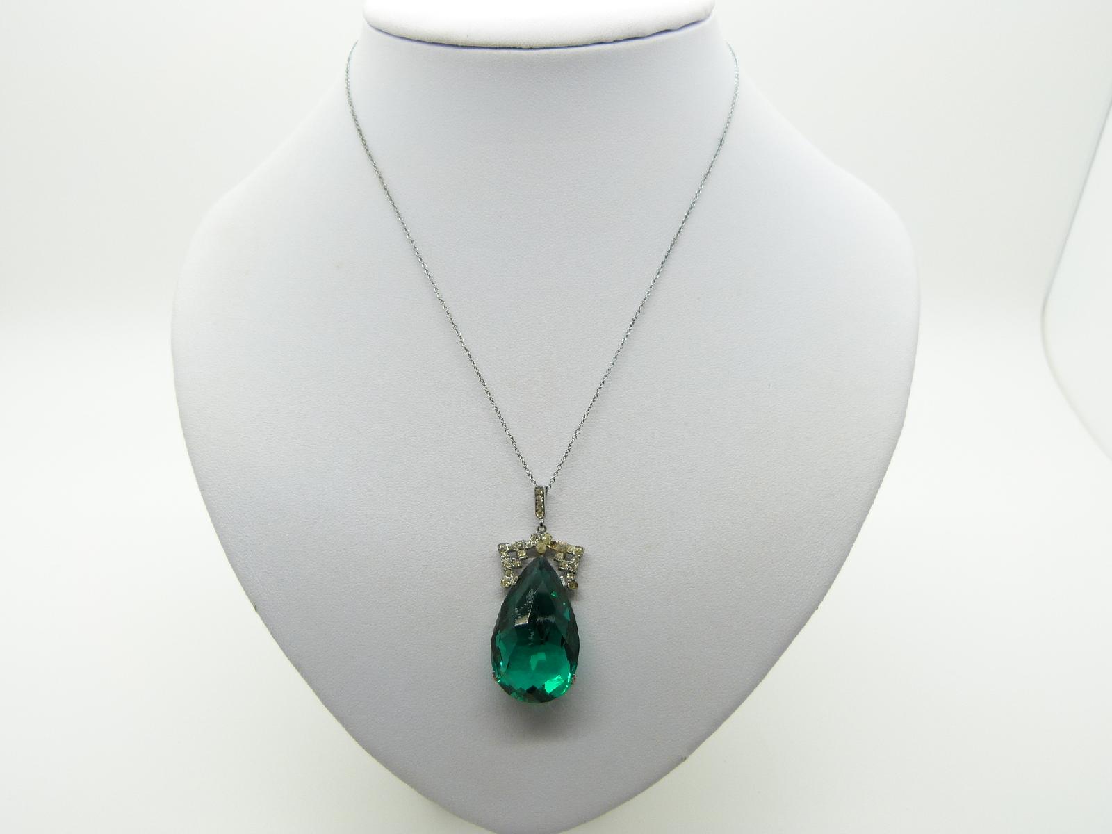 Vintage 30s Pretty Emerald Green Glass Crystal Pendant and Chain