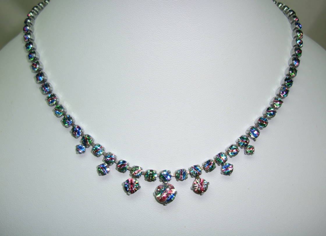 Vintage 30s Stunning Iris Glass Rainbow Diamante Drop Necklace Sparkly