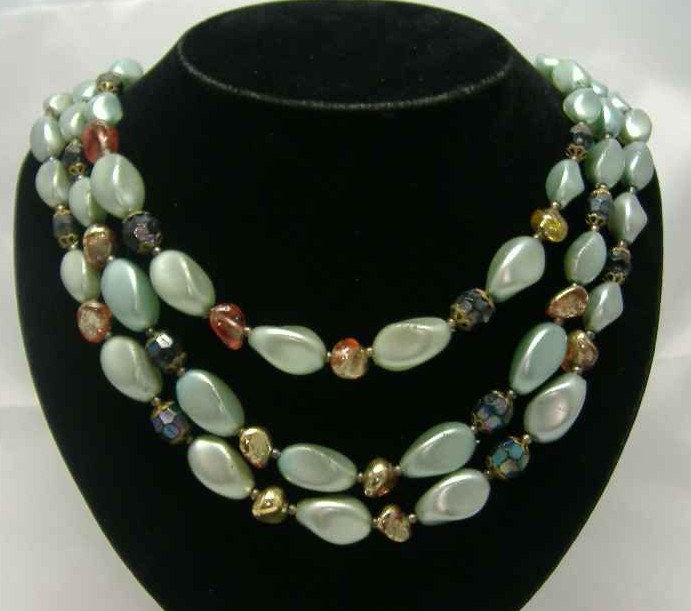 Vintage 50s three row mint green faux pearl glass bead necklace interspersed with black ab crystal beads and gold beads. Super quality vintage necklace - great weight to it as well.  Som wear here and there to the faux pearl beads, nevertheless, a great vintage piece.