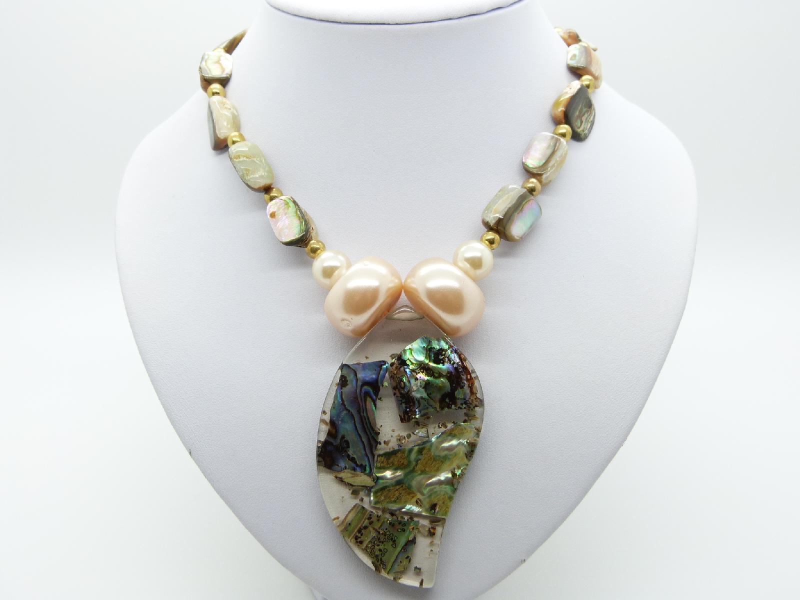 Stunning vintage 1950s abalone bead and faux pearl bead necklace featuring a stunning large lucite pendant incorporating large abalone shell pieces.  Very unusual and quirky, looks stunning on, a real statement piece, excellent condition.  Measures 55cms in length.