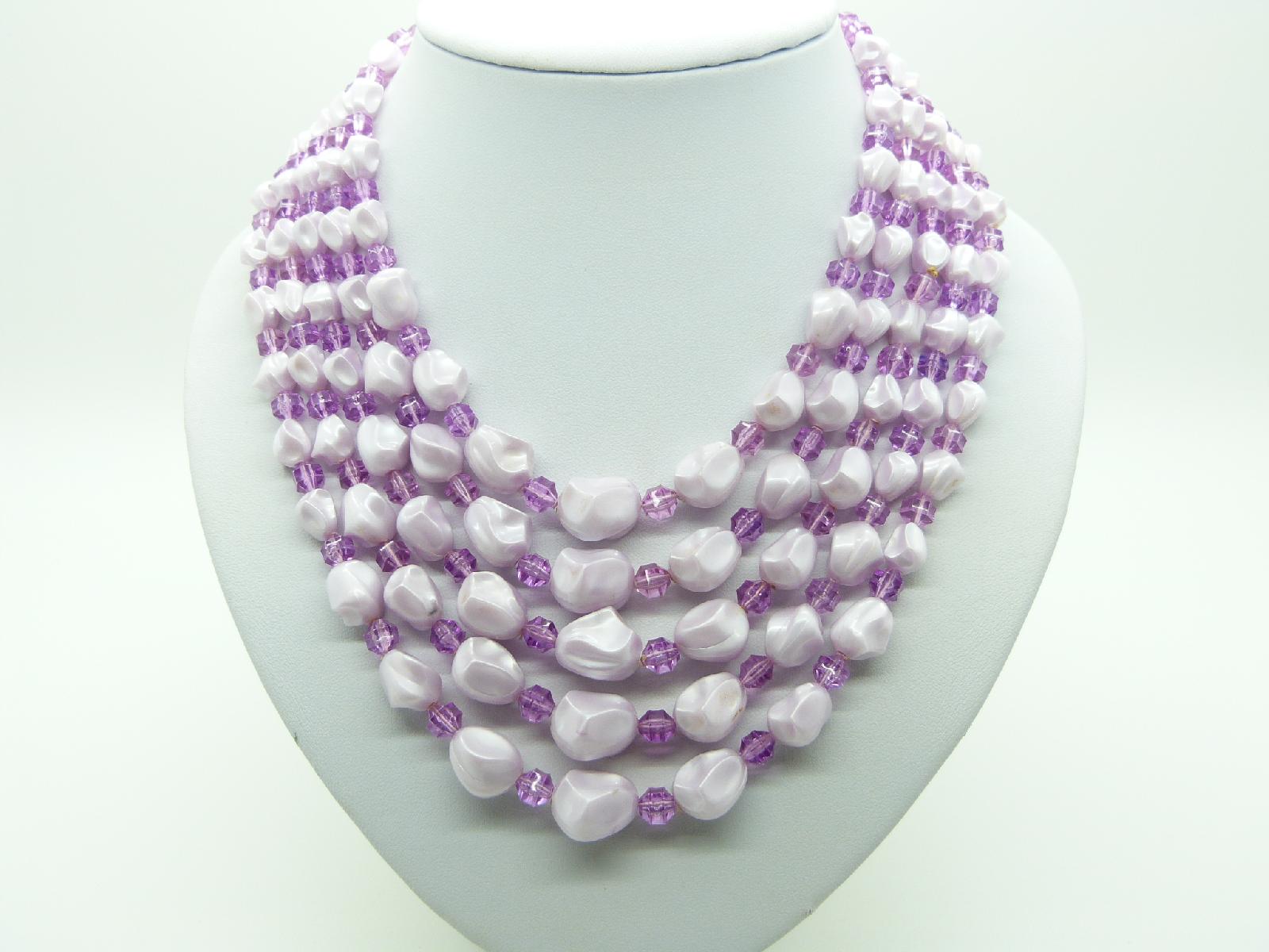 Vintage 50s Amazing Five Row Lilac Pink Textured Lucite Bead Necklace Mint!