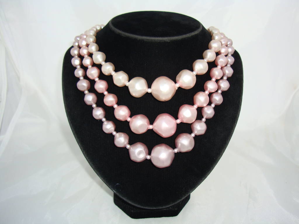 Vintage 50s Chunky 3 Row Shades of Pink Faux Pearl Bead Necklace
