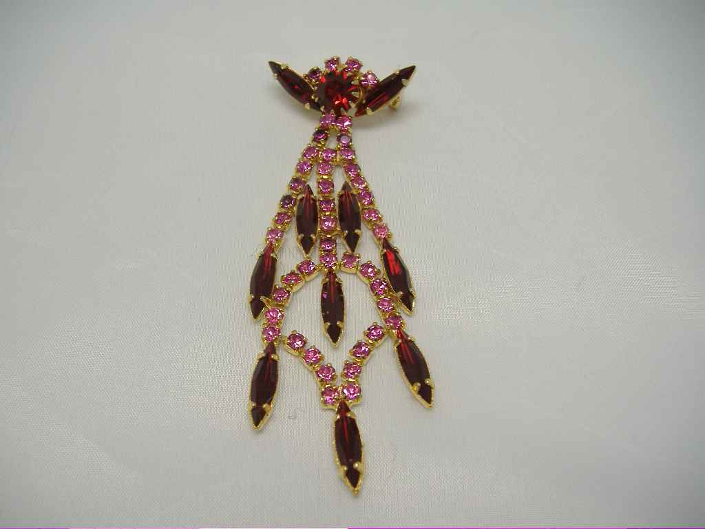 Vintage 50s Deco Style Sparkling Red and Pink Diamante Drop Brooch