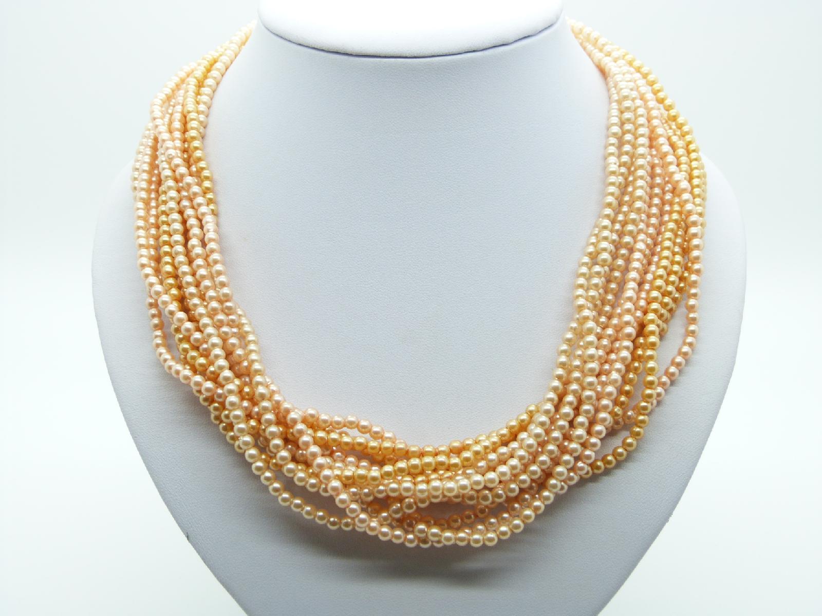 Vintage 1950s multi strand 12 row shades of pale orange faux pearl plastic bead necklace, can be worn as is or twisted for a choker look.  Excellent condition, measures 54cms including extender.  Very comfortable to wear as nice and light, very feminine and chic. Stamped Hong Kong on fastener hook.