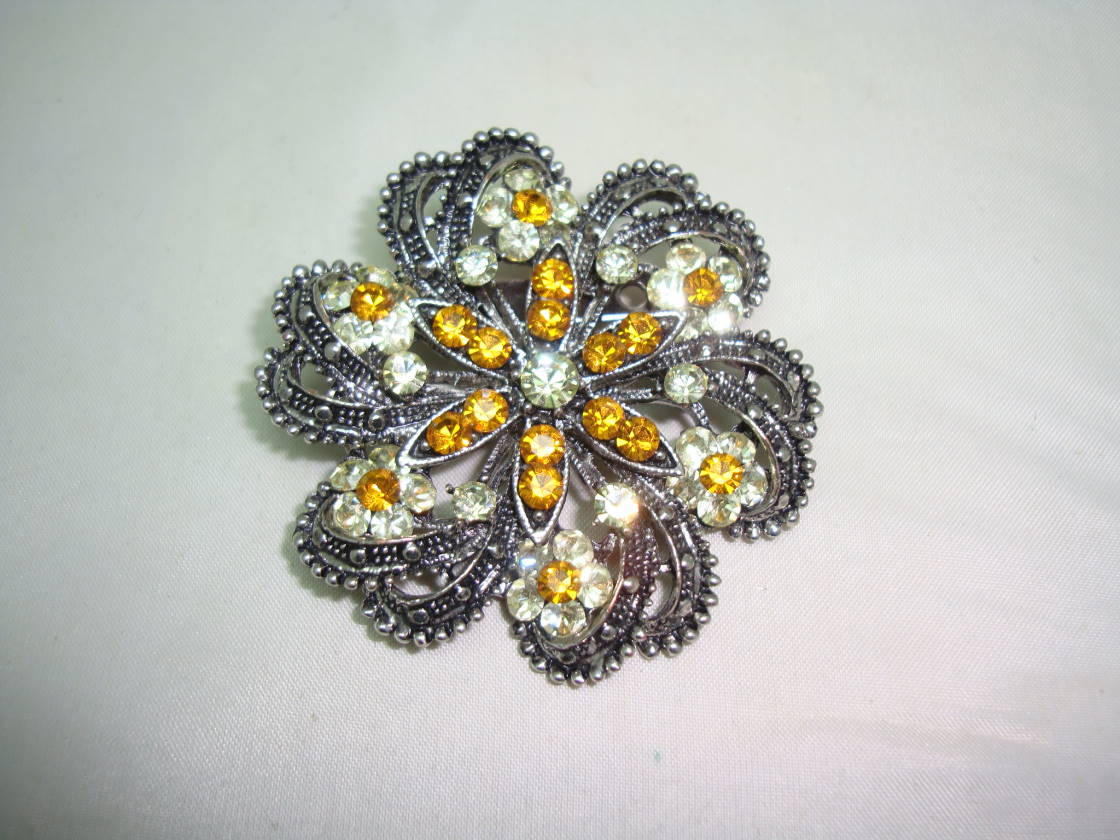 I am pleased to offer this lovely vintage 1950s ornate silvertone flower shaped brooch set with sparkling orange and lemon coloured diamante stones.  Excellent vintage condition, looks super on.