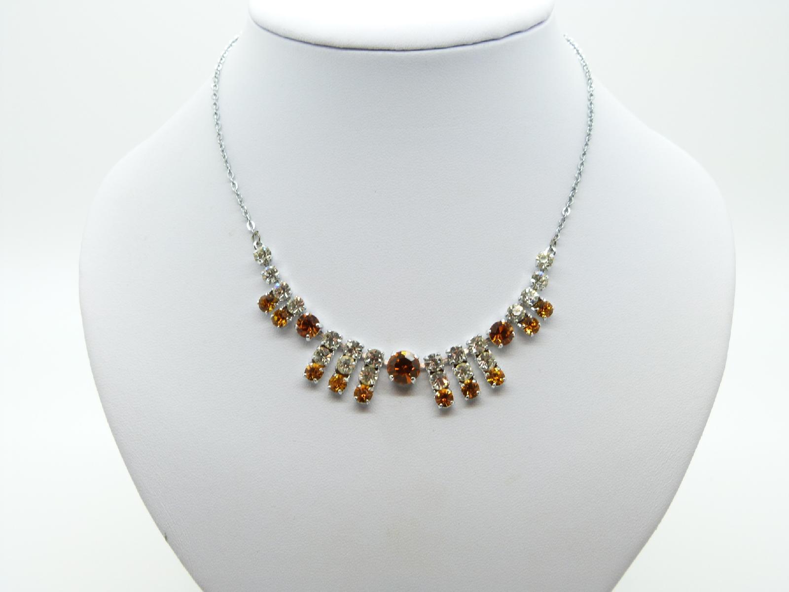 Vintage 50s Pretty Amber and Clear Diamante Drop Silvertone Chain Necklace
