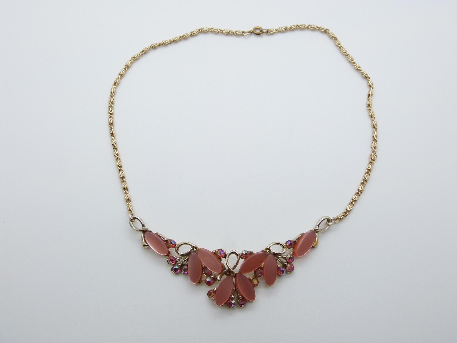 Vintage 50s Pretty Orange Lucite Moonglow and AB Diamante Necklace 44cms