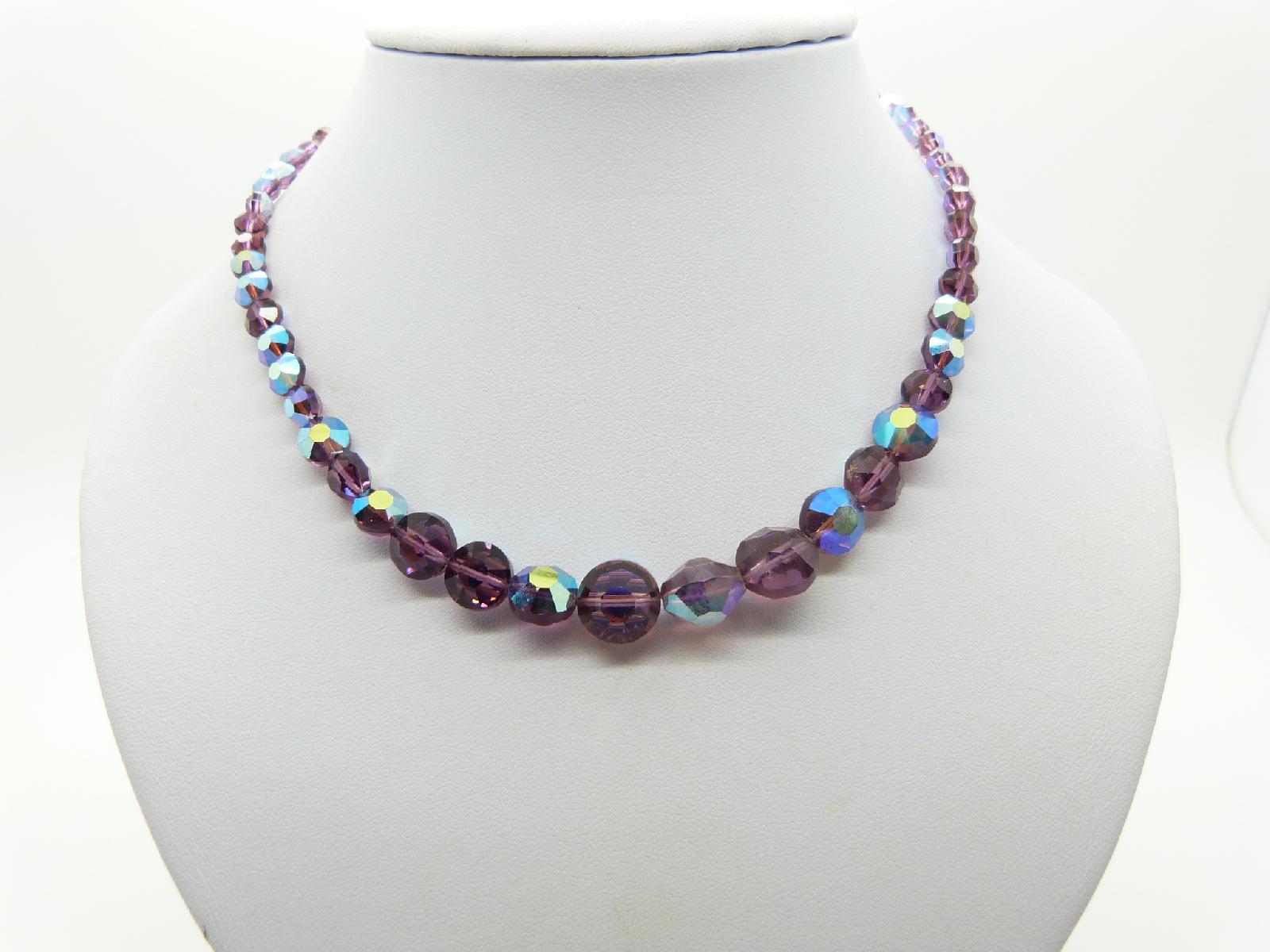 Vintage 50s Signed Exquisite Purple AB Crystal Glass Bead Necklace Diamante Clasp