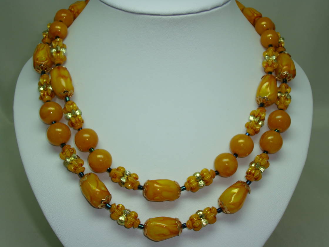 Vintage 50s Stunning 2 Row Amber & Gold Lucite Lustre Bead Necklace
