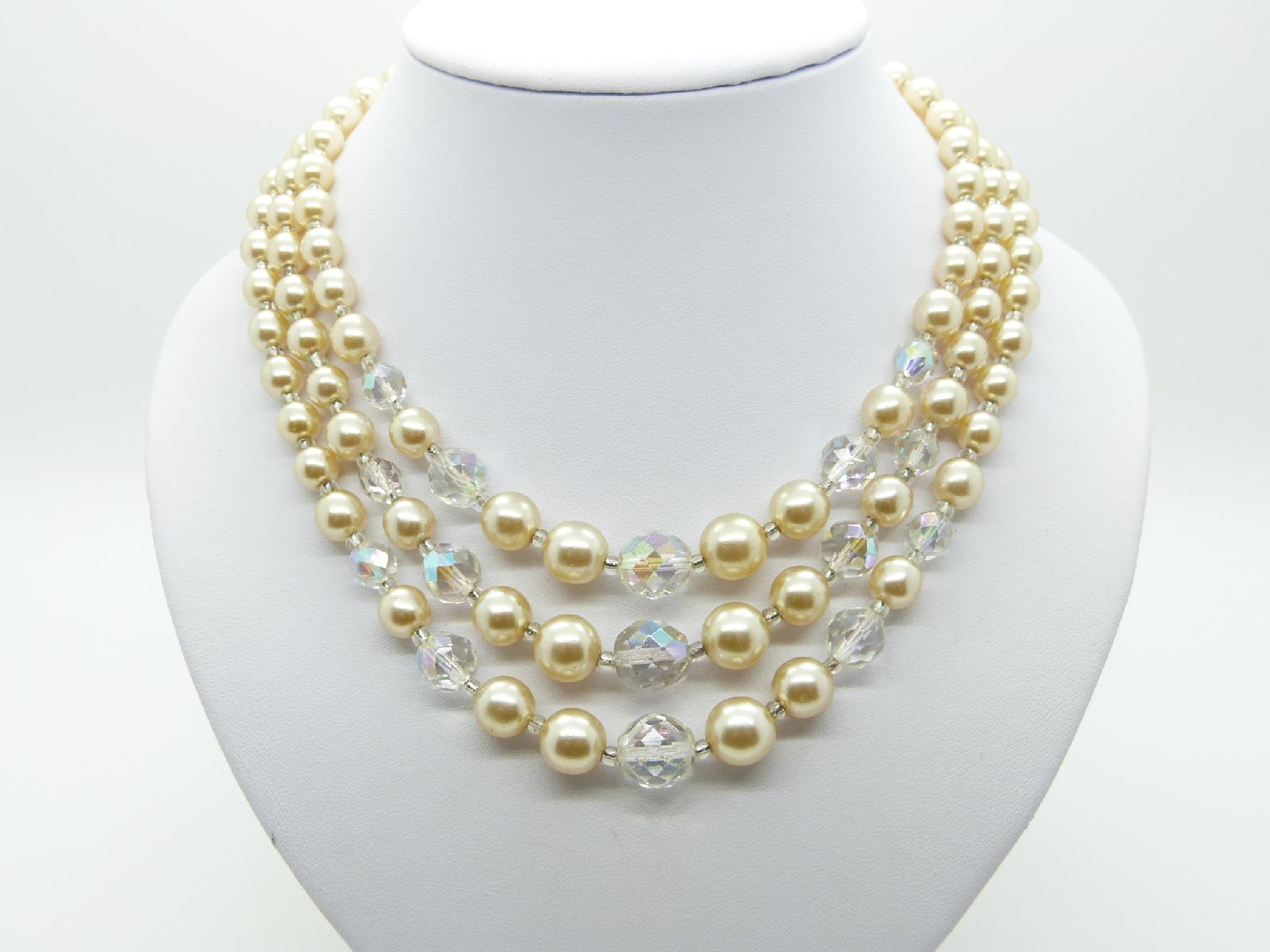 Vintage 50s Stunning Three Row Crystal and Faux Pearl Glass Bead Necklace