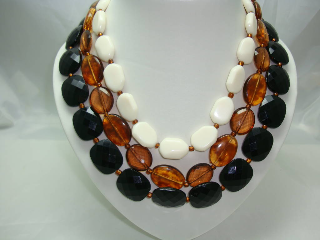 Vintage 50s Style 3 Row Chunky Black Amber Cream Bead Necklace