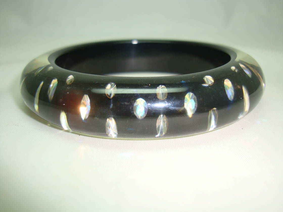 We are pleased to offer this fabulous vintage 1950s STYLE clear lucite and black bangle inset with sparkling ab diamante stones inside the bangle.  As you can see from the photos, the bangle is in very good condition, gently worn, a real stunner!!