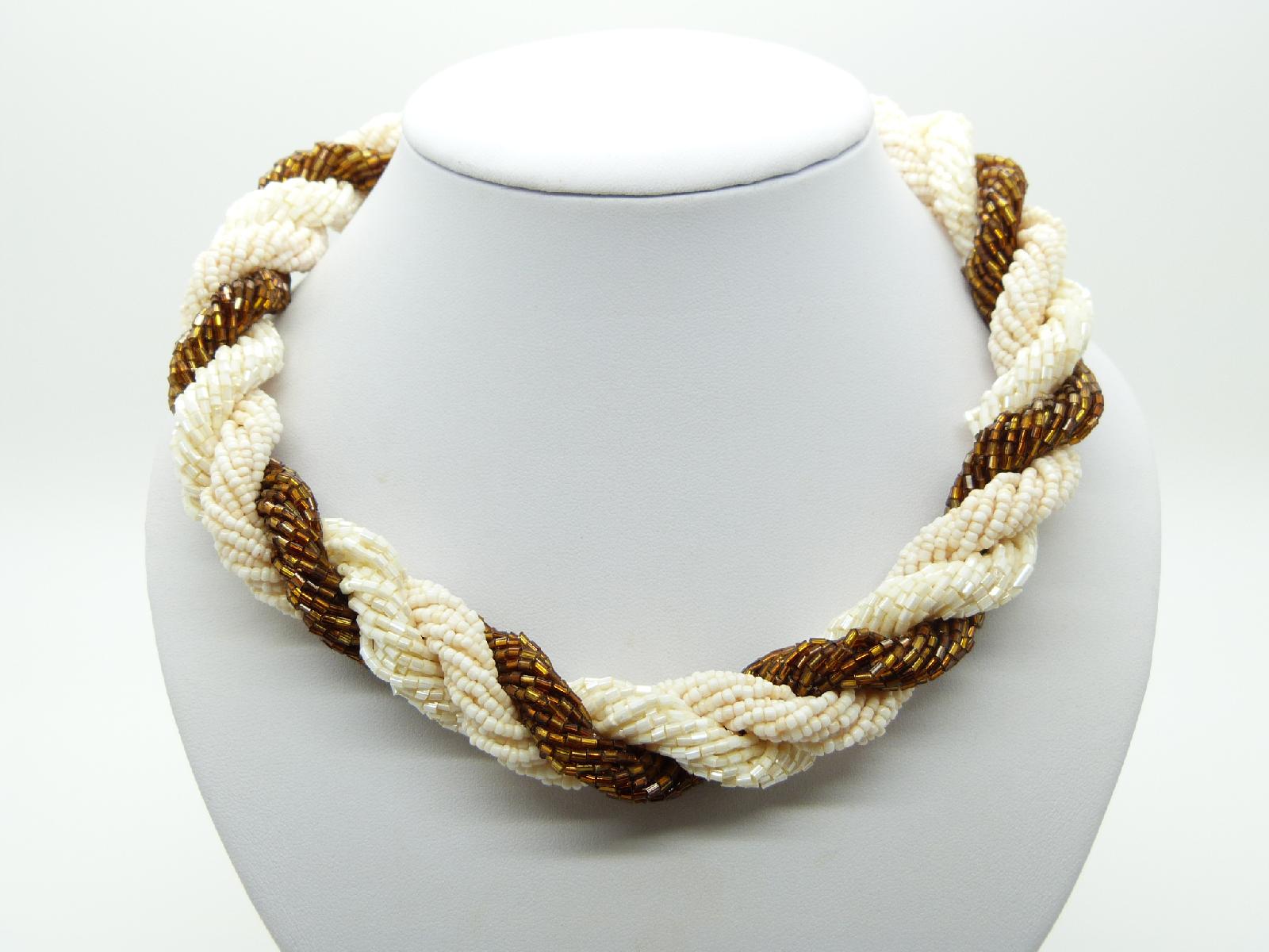 Vintage 50s Three Row Cream Brown Bugle Glass Bead Statement Twist Necklace