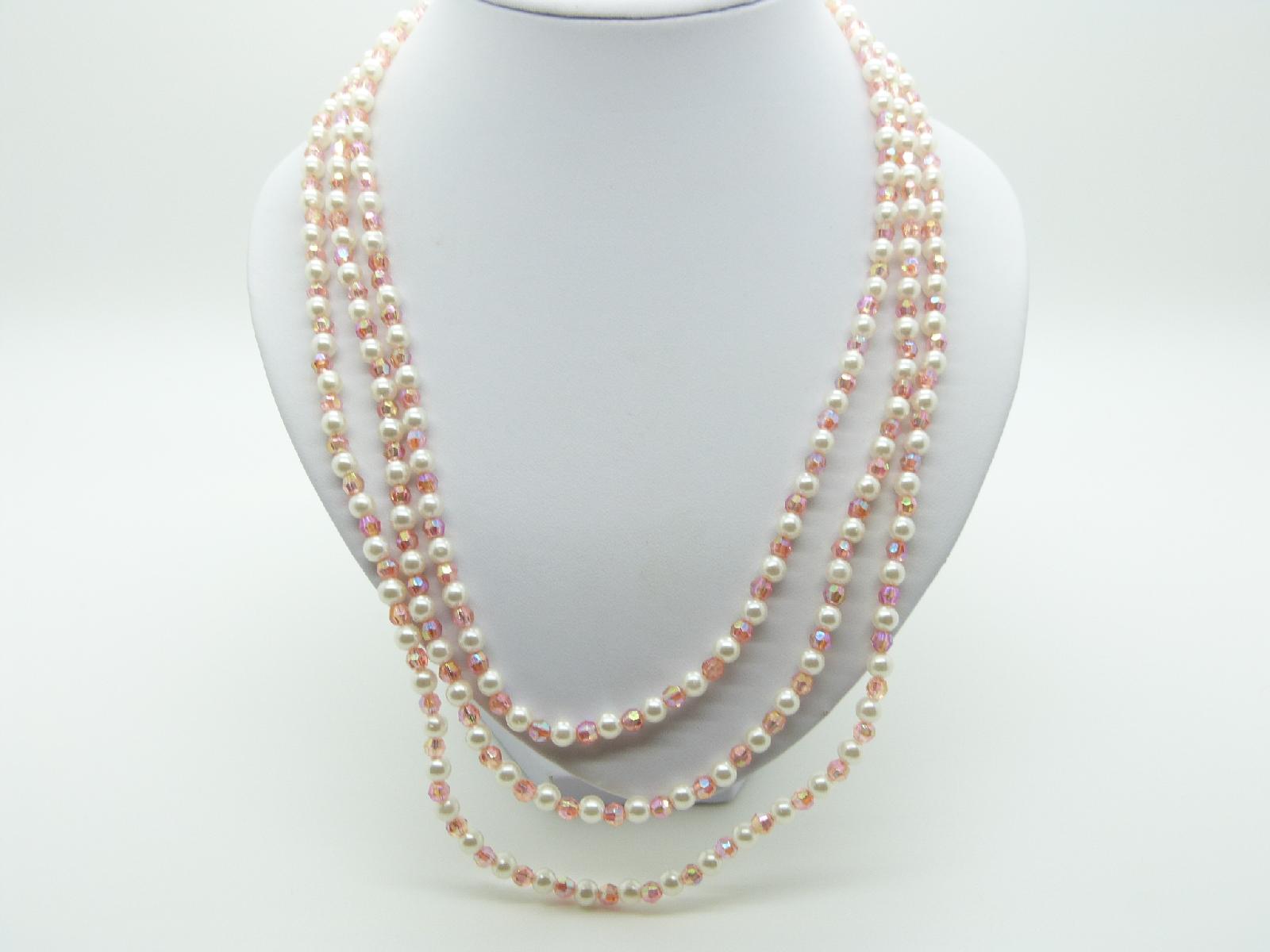 Vintage 50s Three Row Lucite Pink Bead and Plastic Pearl Necklace 66cms
