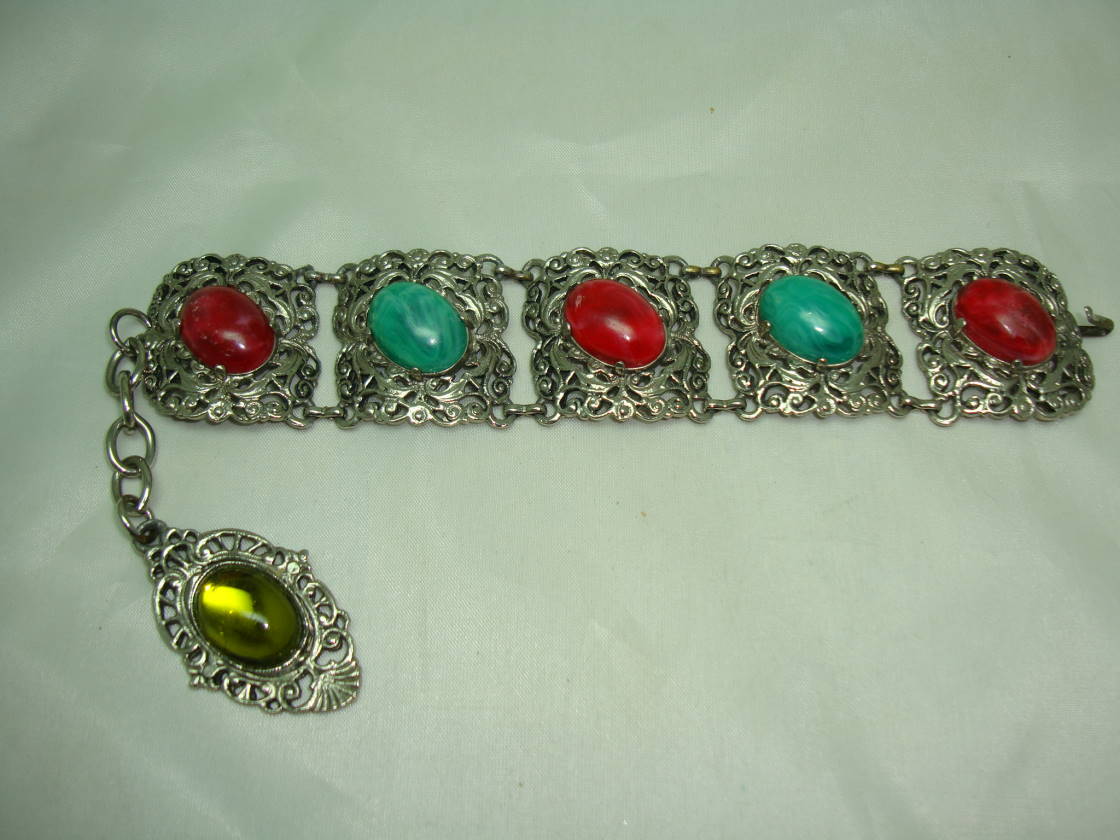Vintage 50s Wide Green & Red Glass Stone Ornate Silvertone Bracelet