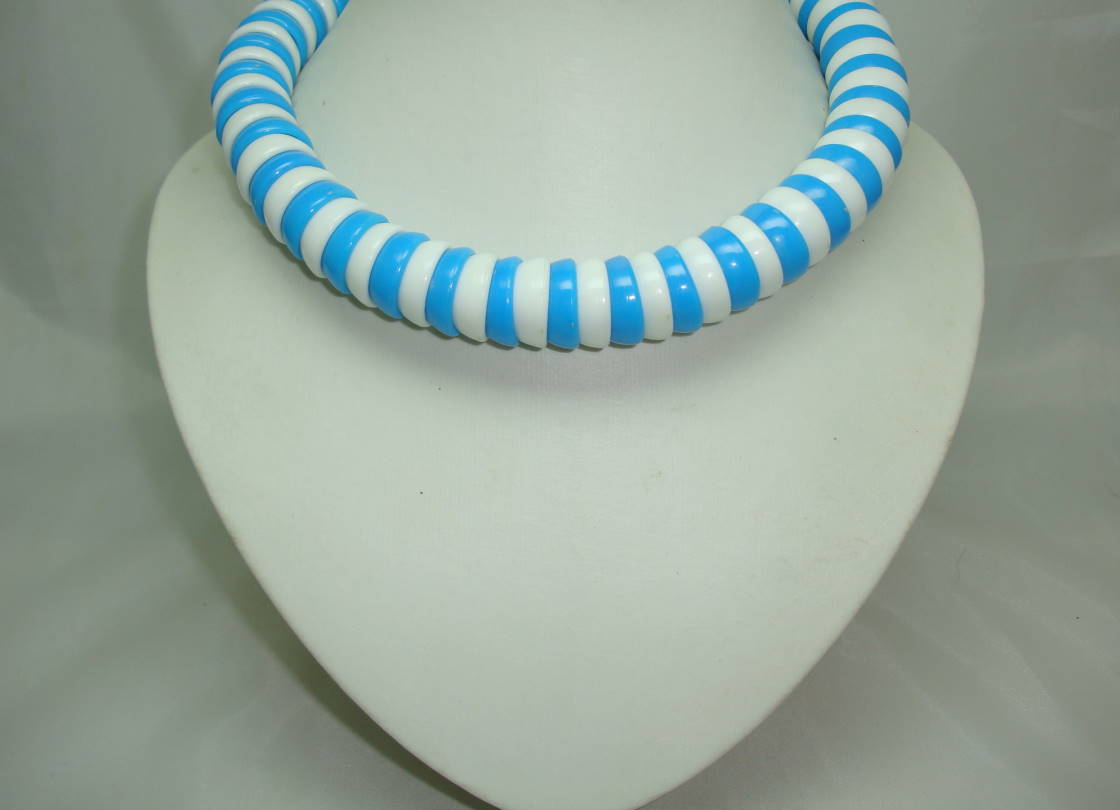 We are pleased to offer this fabulous vintage 1960s chunky turquoise blue and white plastic/lucite articulated bead collar necklace with extender which is just fab.  Excellent vintage condition, very unusual as the beads are half moon shape which fit inside each other making it articulated.  Look really unusual on, a fabulous funky vintage necklace.