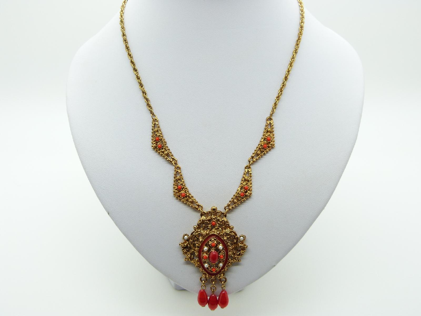 Vintage 60s stunning ornate filigree goldtone pendant necklace set with three red glass dropper beads, decorated with red enamel around centre with faux pearls and orange glass beads, lovely quality and looks stunning on, a real eye catcher, very unusual, fastens with bolt ring fastener, this looks like an unsigned designer piece.  Measures 47cms in length, pendant measures 8cms in length. Excellent condition!