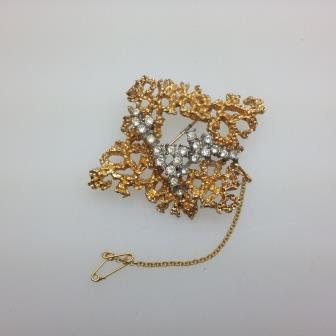 Vintage 60s Quality Modernist Diamante Goldtone Brooch Safety Chain 6.5cms