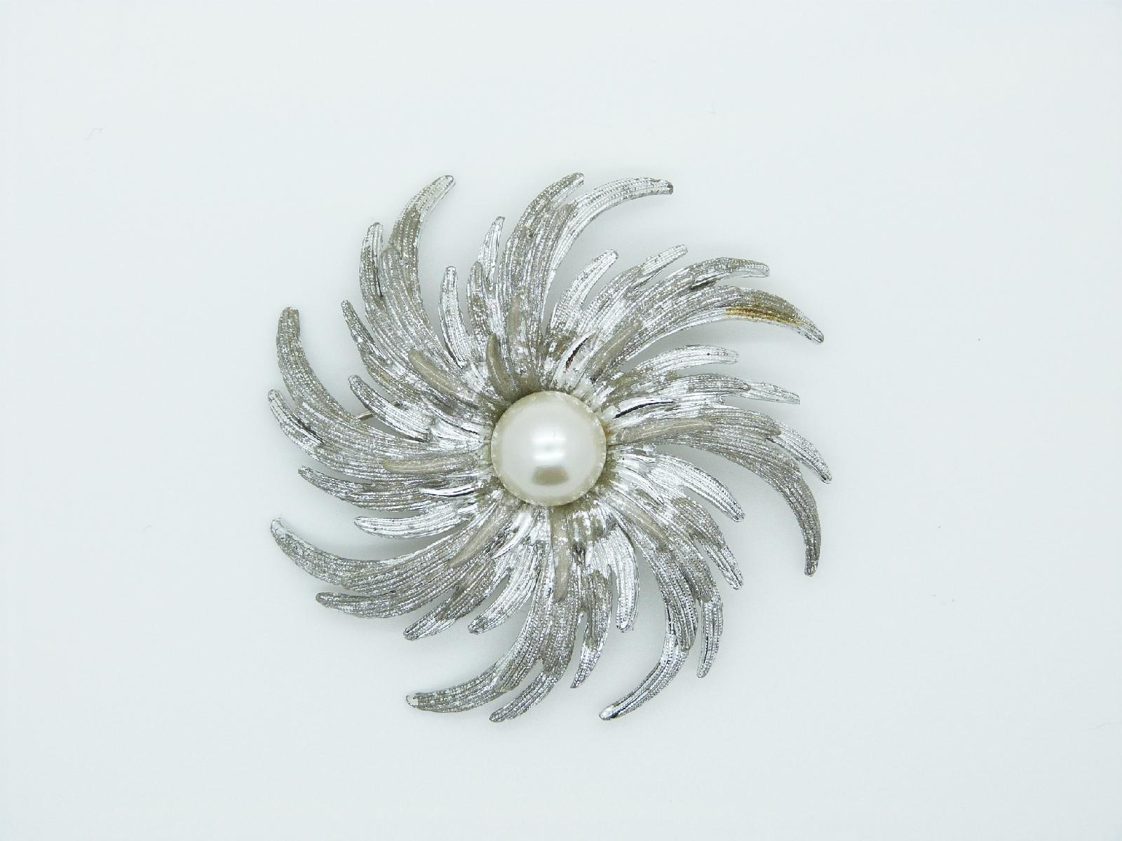 Vintage 60s Signed Sarah Cov Large Silvertone Swirl Pearl Design Brooch