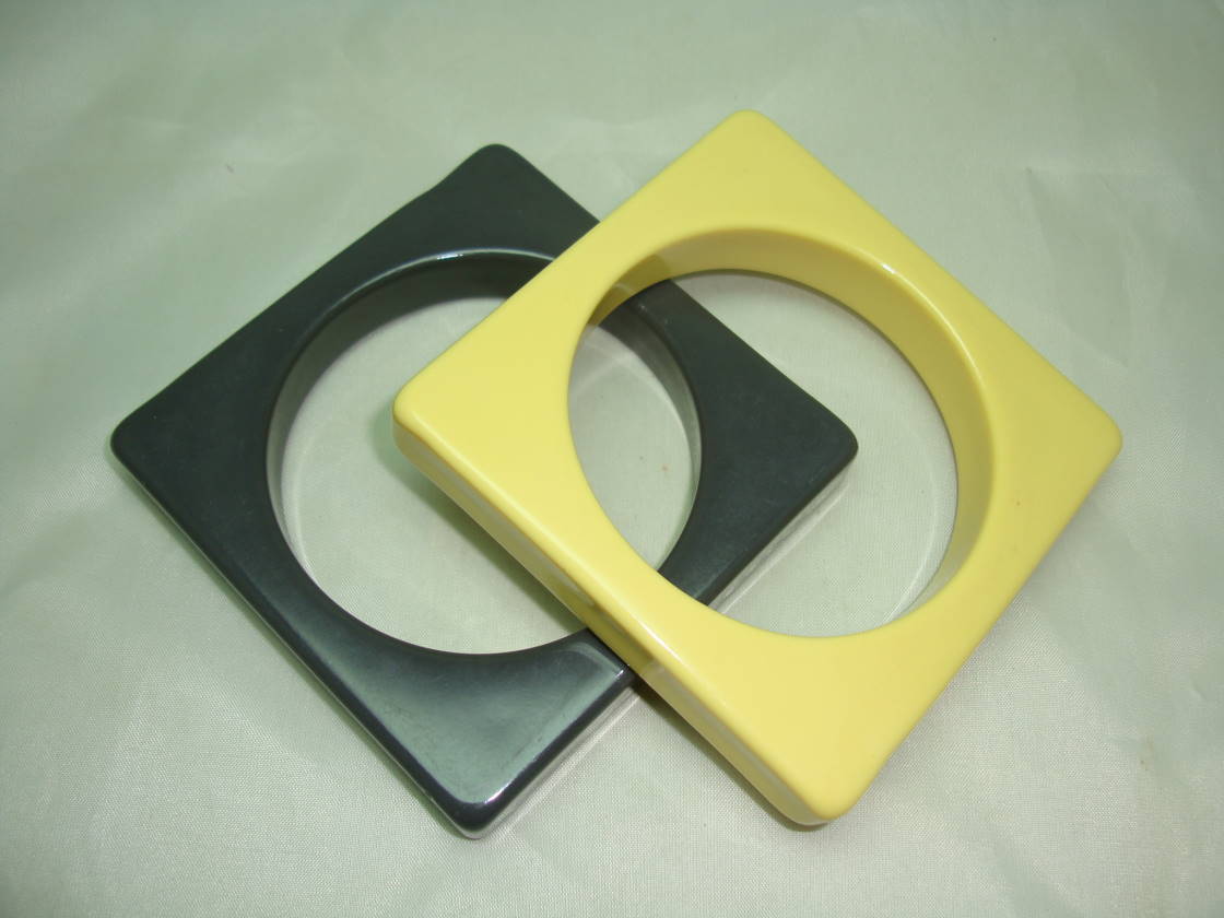 Vintage 70s Fab Pair of Yellow and Grey Square Chunky Plastic Bangles