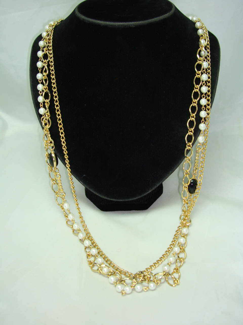 We are pleased to offer this fabulous vintage quality 1980s long 3 row goldtone chain and faux pearl bead necklace which is just great.  As you can see from the photos, the necklace is in excellent condition and looks really stunning on, the necklace is made up of two rows of goldtone chains and a middle row of glass faux pearl beads with black lucite oval bead on each side connected with a fancy goldtone twist link.  This necklace is bang on trend for the autumn/winter so don't miss out on this one.