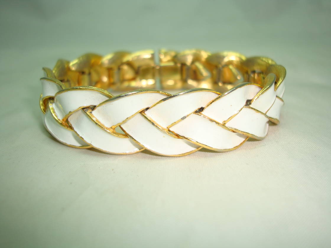 Vintage 80s Fab Quality White Enamel Goldtone Plait Design Bracelet