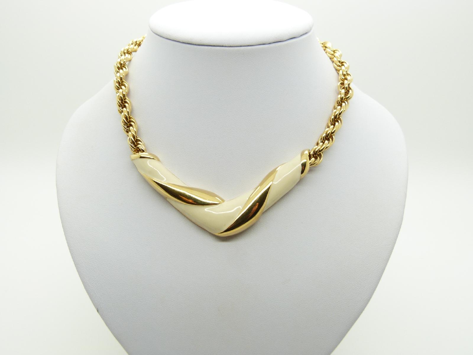 Vintage 80s Quality Designer Cream Enamel and Goldtone V Shaped Necklace
