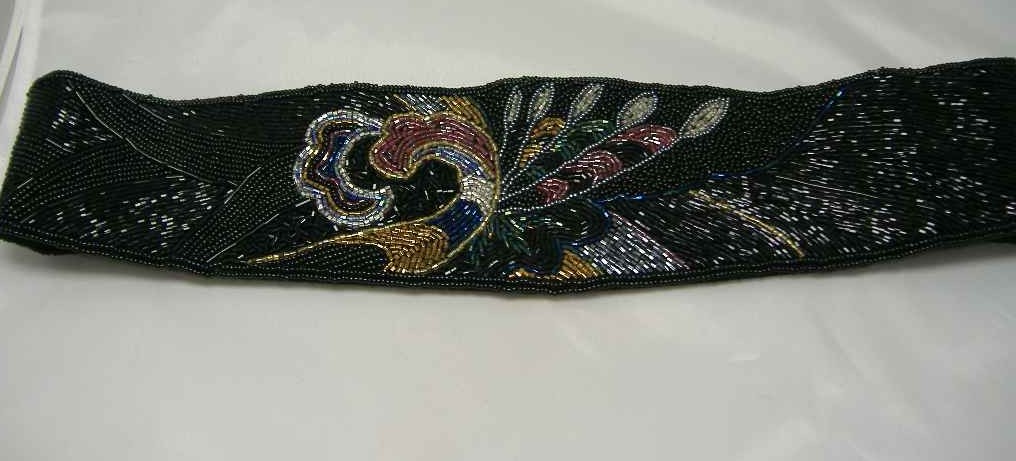 We are pleased to offer this stunning vintage 1980s wide black cumberbund belt embellished with black and multicoloured seed bead and bugle beads in a fabulous floral design.  Reverse of belt is lined in lovely black satin, a very well made attractive belt which would look great with a black black evening dress for a cinched in look.  As you can see from the photos, the belt is in mint condition, don't think it has ever been used, looks stunning on, great sparkle and shine, fastens at the back with velcro, don't miss out on this one ladies!