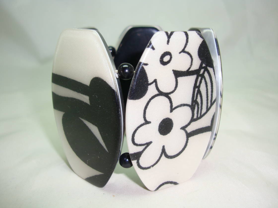 Unusual black and white abstract floral design acrylic/plastic elasticated cuff bracelet. Excellent condition as bracelet is a new, modern piece.  Looks fab on, fits really nice around wrist, a quirky, eye catching piece.